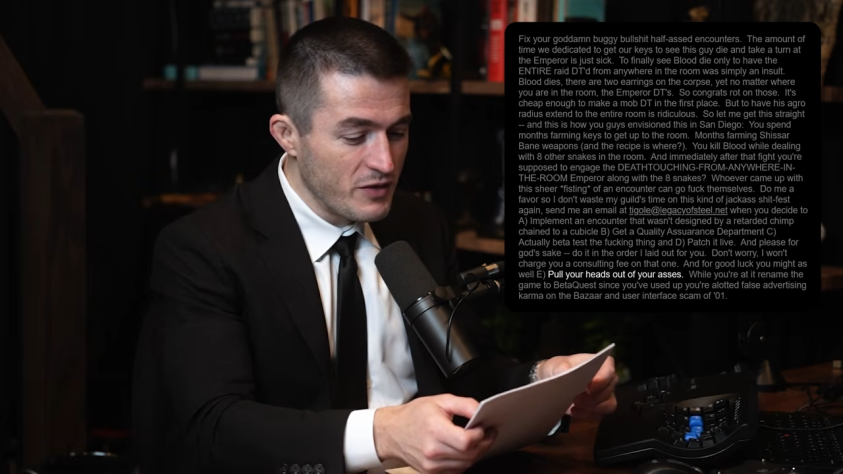 На скриншоте одно из его сообщений на форуме EverQuest. Каплан использовал фразы вроде: «Почините свои проклятые забагованные сырые бои», «тот, кто придумал этот фистинг вместо боя может проследовать нах**» и «переименуйте свою игру в BetaQuest». По мнению Каплана, это связано не только с тем, что он был молод и горяч, но и с тем, что природа общения в интернете часто заставляет изливать больше негатива, чем позитива.