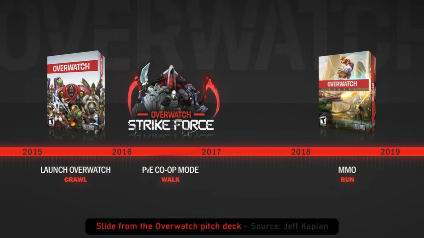 - Чтобы убедить начальство, команда придумала метафору «сначала ползёшь, потом идёшь, потом бежишь». Мол, неудача Titan состояла в том, что там Blizzard сразу хотела «бежать», хотя World of Warcraft сперва «ползла» — то есть начала свою историю с первой Warcraft. Вот и с Overwatch так же: сперва необходимо сделать относительно небольшую PvP-игру, спустя годик вкинуть PvE, а уже после этого (году к 2019-му) замахнуться на MMO.