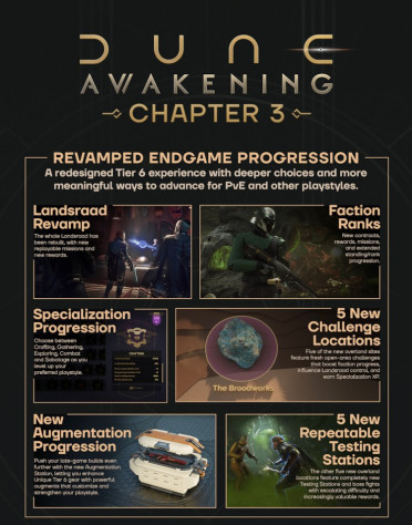 - Геймеры часто жалуются, что эндгейм в Dune: Awakening пустоват. Исправить это призвана третья глава. Разработчики изменили систему Ландсраада, благодаря которой у игроков появится больше заданий, новые награды и возможности выбирать понравившийся стиль игры. Пользователи смогут самостоятельно выбирать поручения, которые позволят зарабатывать репутацию во фракции, завоёвывать расположение Великих домов и получать опыт для специализаций.