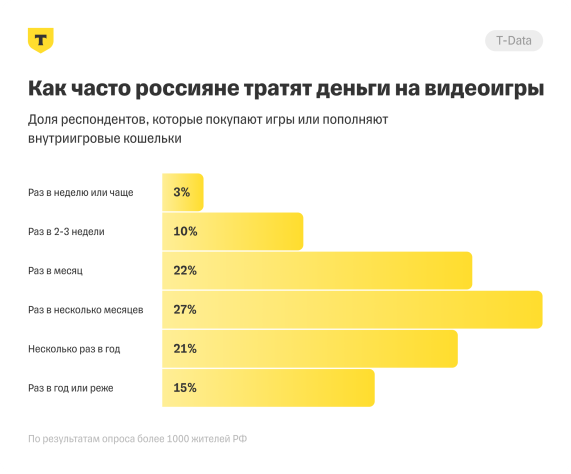 • Большинство опрошенных (27 %) покупают игры раз в несколько месяцев. Остальные респонденты предпочитают делать это раз в месяц (22 %) или несколько раз в год (21 %).