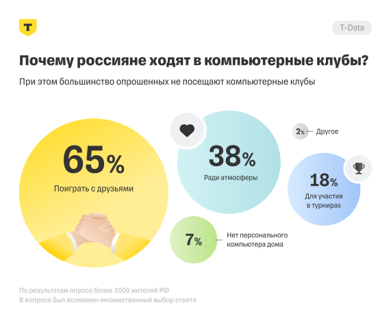 • Главной причиной похода в компьютерный клуб геймеры называют возможность провести время с друзьями — такой ответ дали 69 % опрошенных. Другие варианты: особая атмосфера в клубе (38 %), участие в турнирах (18 %), нет своего ПК дома (7 %).