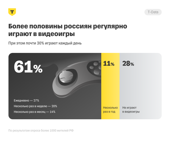 • На регулярной основе в играх зависают более половины россиян — 61 %: из них 27 % делают это ежедневно, 20 % запускают игры несколько раз в неделю, а 14 % — несколько раз в месяц.