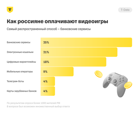 В исследовании приняли участие более 1 тысячи россиян старше 18 лет, проживающие во всех регионах страны. Кроме того, анализ основан и на обезличенных данных клиентов Т-Банка, которые оплачивали видеоигры через мобильное приложение и личный кабинет на сайте банка.